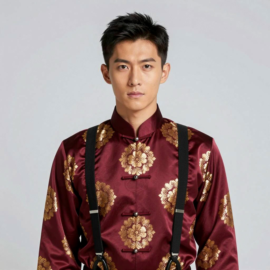 Portrait of a confident Asian man wearing a black leather jacket over a black t-shirt. The subject has short black hair and an edgy, modern fashion style. The background is plain light gray, emphasizing the sleek and fashionable look.