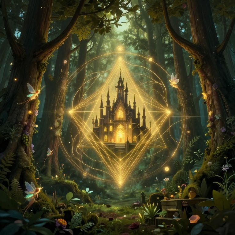 An inverted mystical forest with golden lines and geometric shapes, surrounded by small fairies, inside a castle.
