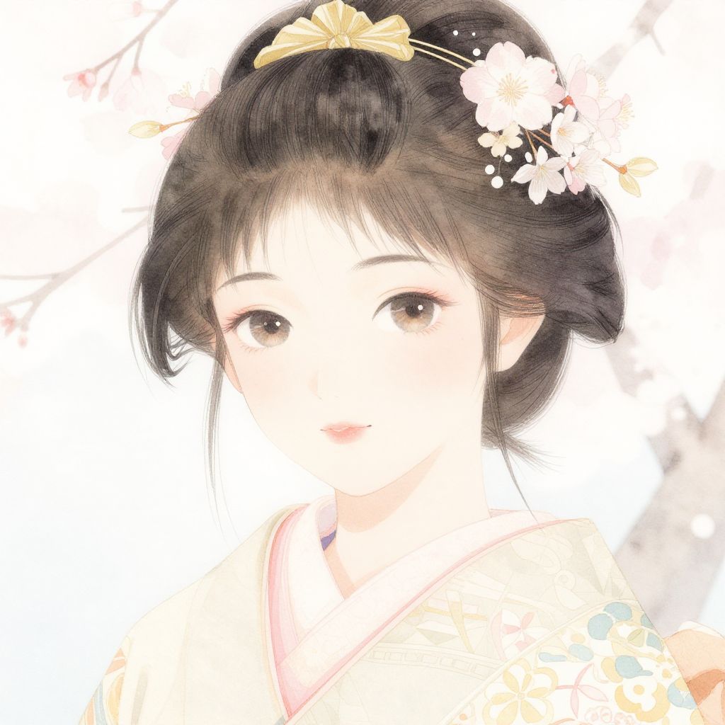 Yoshino depicted as a serene young woman in a traditional Japanese kimono, standing beside a blooming cherry blossom tree under soft morning light, intricate patterns on her clothing and a gentle smile, delicate watercolor style.