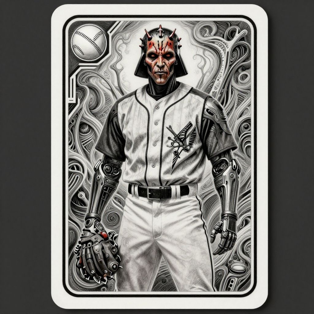 Cinematic film still of Darth Maul in a baseball uniform posed for a classic baseball trading card, in biomorphic, biomechanical style, retro futurism, science fiction, fusing body horror with nightmarish detail, intricate design, sharp focus, with a monochromatic palette and low saturation, 8K, photorealistic pencil drawing