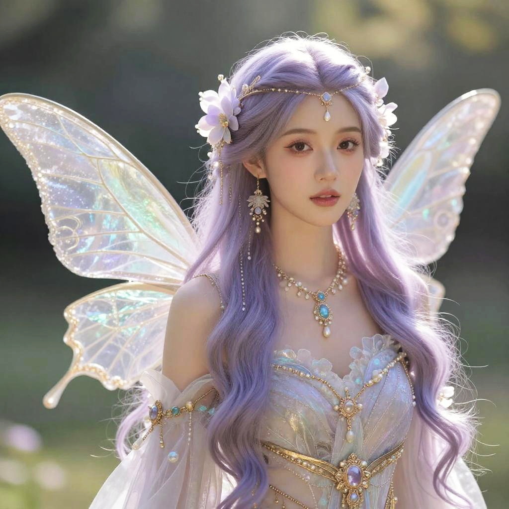 A beautifully detailed digital portrait of a young woman with striking violet hair adorned with roses and a jeweled tiara. She wears an elegant white dress with floral embellishments and delicate jewelry, holding two pink roses close to her chest. The artwork showcases a soft, princess-like aesthetic with a focus on fantasy and ethereal beauty.