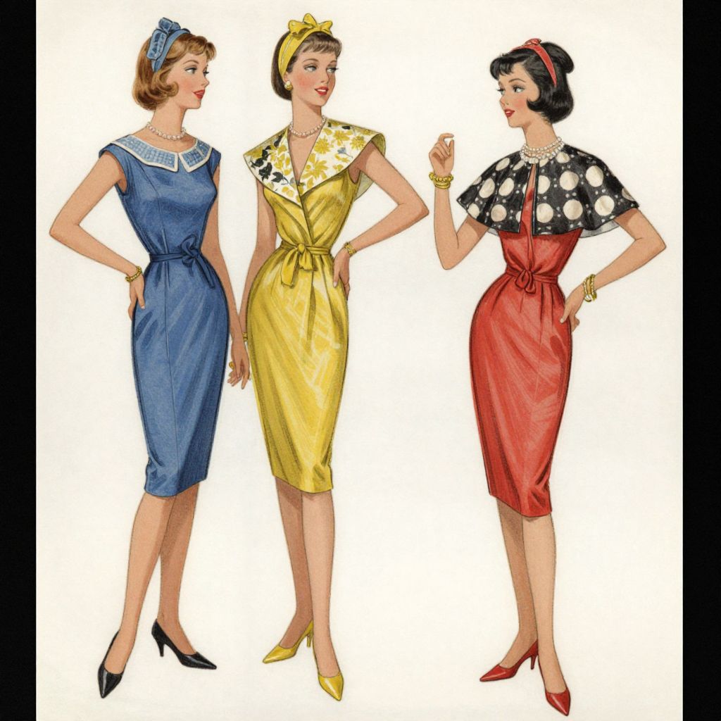 A vintage 1950s Vogue pattern featuring a retro illustration of two women modeling a one-piece dress and capelet ensemble, showcasing a classic mid-century fashion design with bold colors and elegant silhouettes.