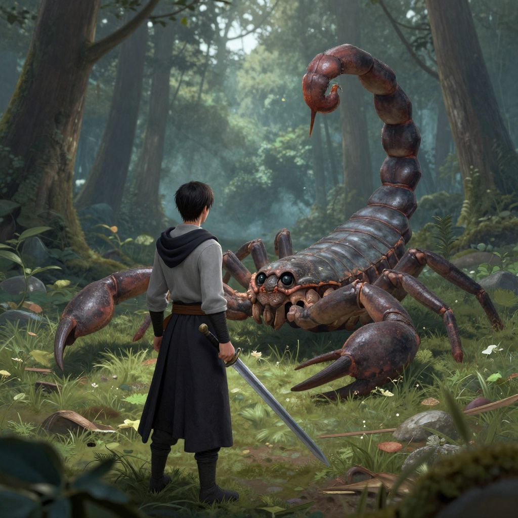 A young man with a sword stands in a forest, facing a giant scorpion-like creature with a long tail.