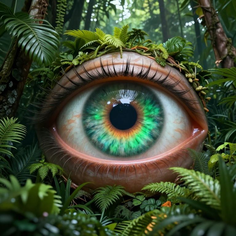 A surreal digital artwork depicts a colossal, anthropomorphic eye seamlessly integrated into a lush jungle canopy, its vibrant green iris and intricate details rendered in high-definition realism, creating an eerie yet captivating visual effect as it watches eternally without blinking.