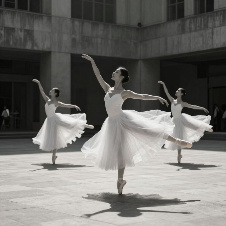 Graceful ballerinas in flowing white dresses dance across a desolate urban plaza, their ethereal forms defying the stark, concrete surroundings in a surreal ballet of light and shadow.