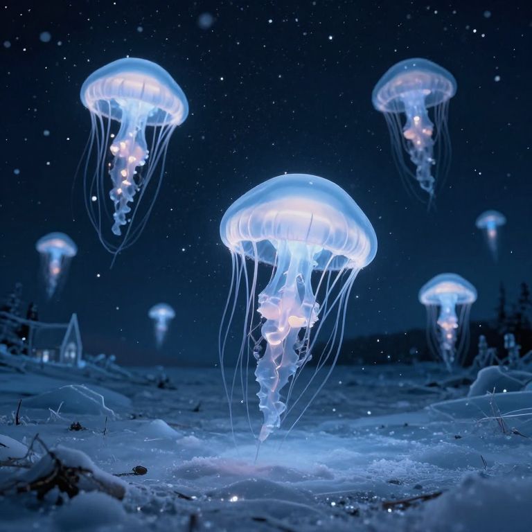 Suspended between the heavens and the frozen earth, ethereal jellyfish cradle ghostly cities, their bioluminescent glow casting a haunting serenity over the desolate tundra, where the whispers of forgotten dreams drift like snowflakes in the still night air.