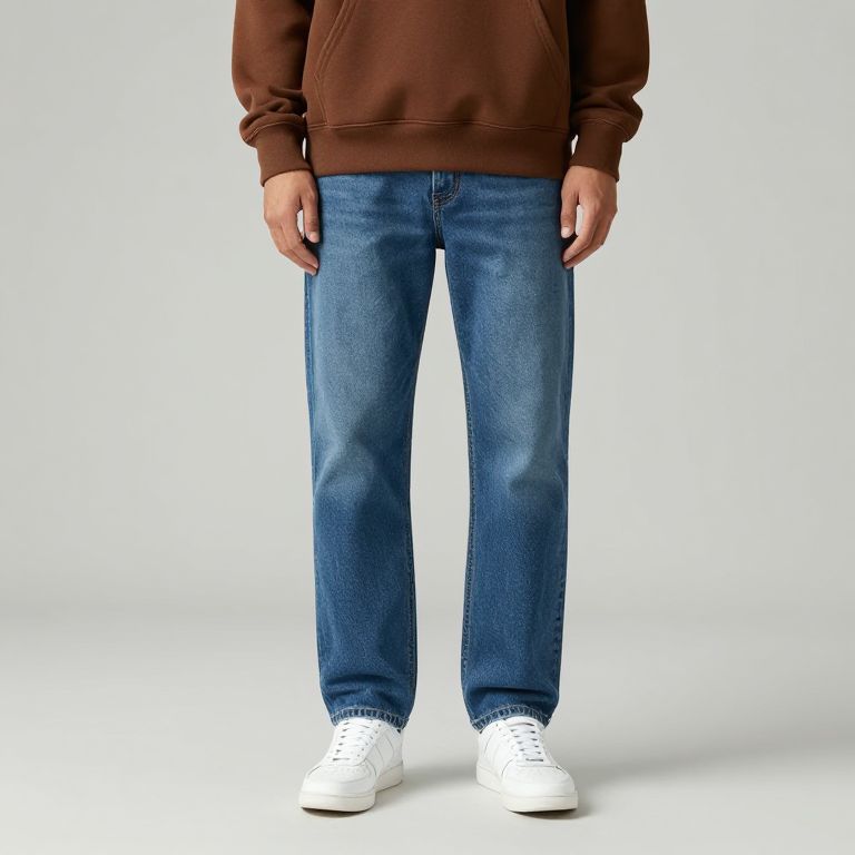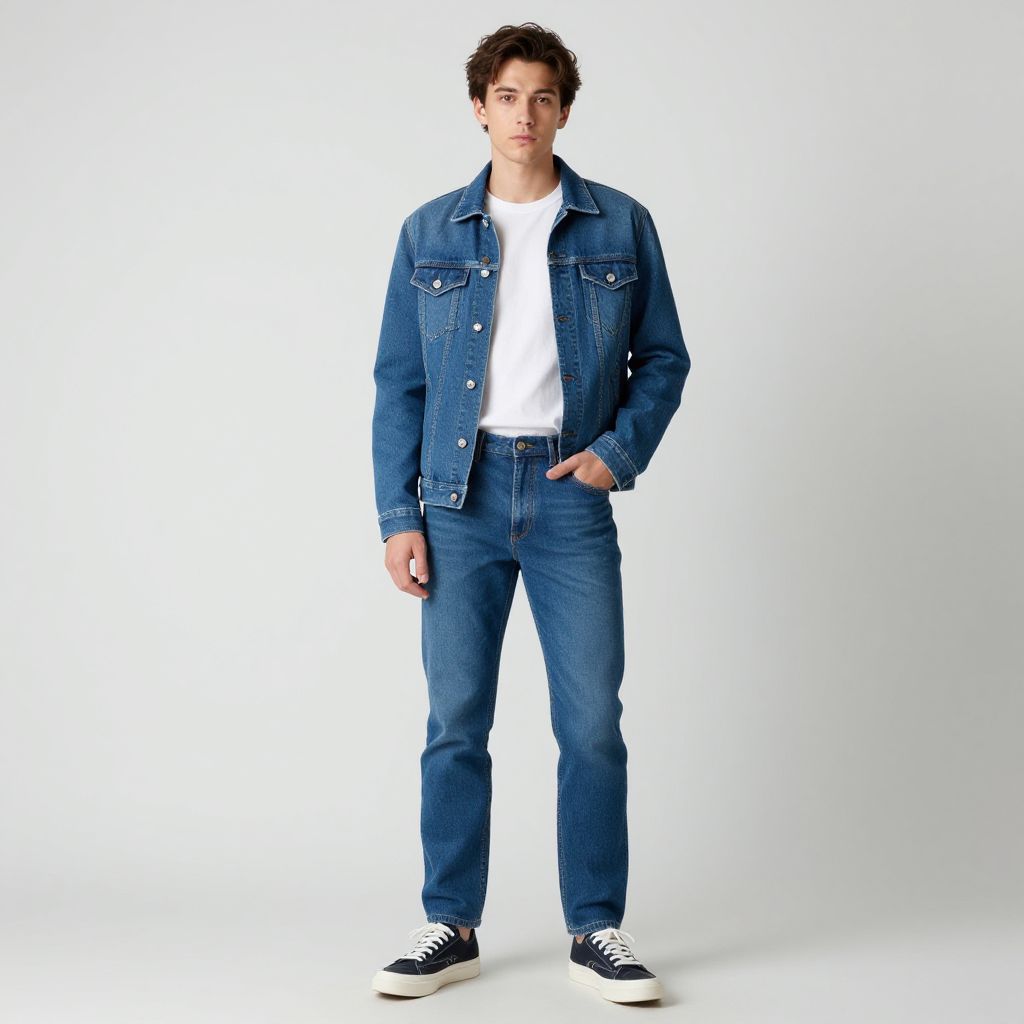 Photograph of a young Caucasian man with tousled brown hair and light skin, standing against a plain white background. He wears a blue and white plaid shirt with long sleeves, open over a plain white t-shirt, and loose-fitting blue jeans. His expression is neutral, with a slight gaze to the right. The plaid shirt features a small dark blue logo on the left chest. The lighting is even, highlighting the textures of the fabric. The overall style is casual and modern.