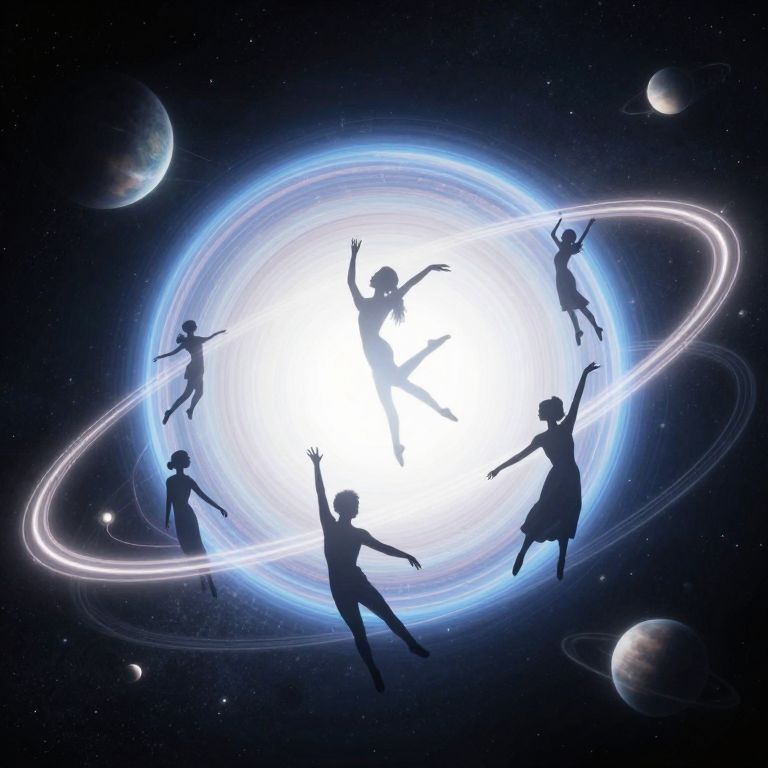Silhouetted girls dancing around a glowing, blue-white ring in a starry, planetary space, creating circular light trails. Digital art.