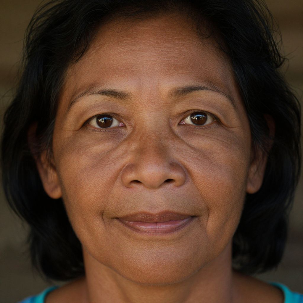 A portrait photograph reveals a middle-aged Micronesian woman with deep brown eyes, framed by short wavy black hair and warm olive skin. Her expression radiates wisdom and gentle humor, captured in intimate close-up detail that showcases the texture of her subtle smile lines and soft complexion. The ambient light softly illuminates her face from below, casting delicate shadows across her high cheekbones while emphasizing the depth and vibrancy of her richly hued eyes. This evokes a sense of vulnerability and resilience, drawing viewers into an intimate connection with her world.