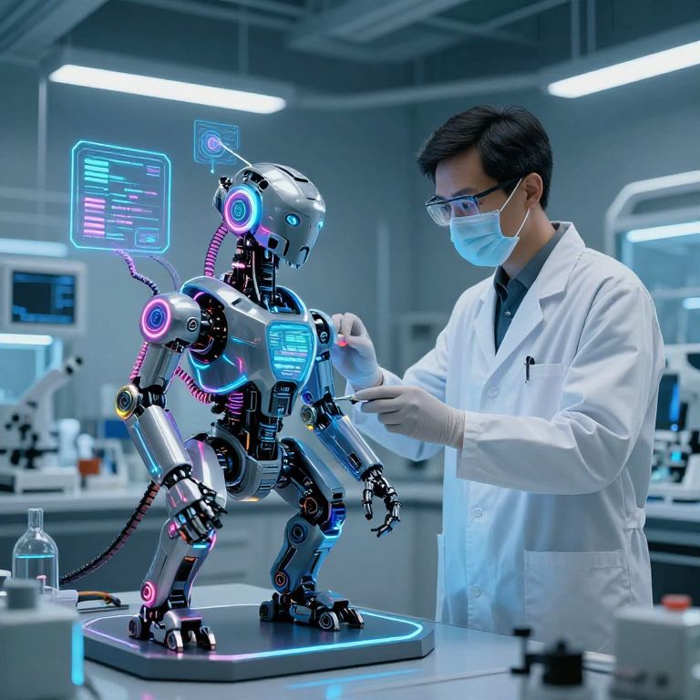 Photograph of a scientist in a white lab coat, mask, and gloves, repairing a glowing, futuristic robotic humanoid in a high-tech laboratory.