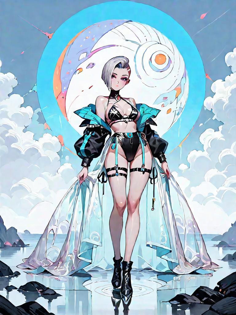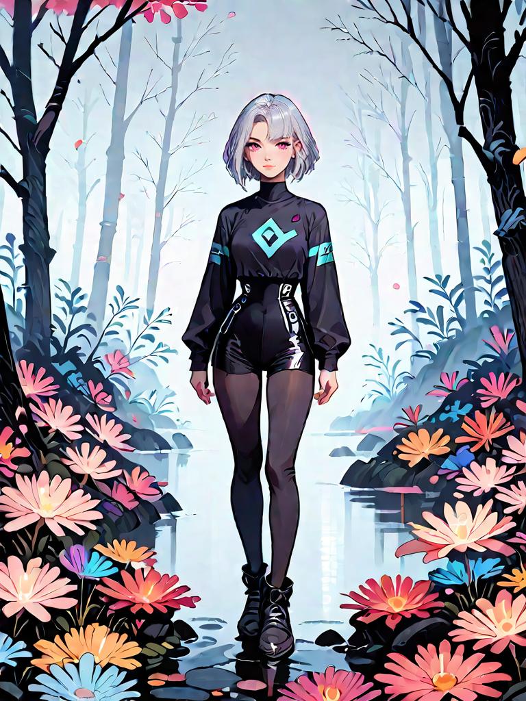 Digital illustration of a full-body young woman with short silver hair standing in a dark fantasy forest amid colorful flowers and trees with bare branches. She wears a sleek black long-sleeve swimsuit with spandex texture, high neckline, shimmering silver sequins, and matching fitted shorts. The scene features a misty, ethereal atmosphere with a subtle light source highlighting her figure. The background includes a reflective water surface and fantasy flora in vibrant coral, blue, and pink hues.