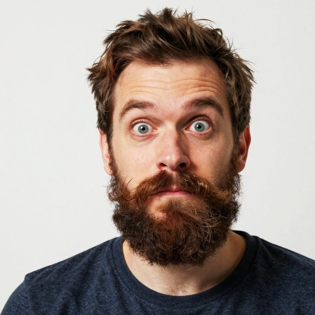 Ugly facial hair on a quirky man with exaggerated messy beard and mismatched mustache, vibrant colors, comic style, humorous and exaggerated features, high detail