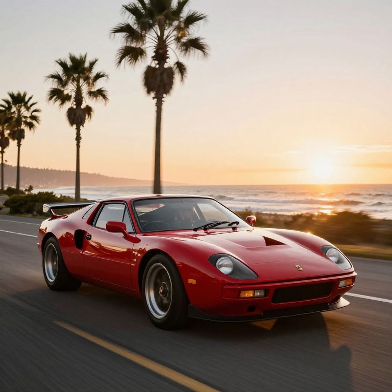 Porsha 944 vintage sports car racing on a coastal road at sunset, sleek aerodynamic design, glossy red paint reflecting golden light, dynamic motion blur, palm trees and ocean waves in the background, cinematic and vibrant atmosphere.