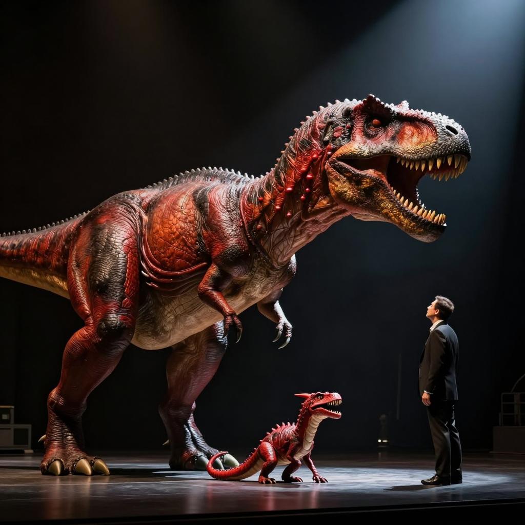 Photograph of a man and a person in a horse costume. The man, in a white shirt and black pants, leans forward with an intense expression, wrists bound. The horse costume person, with blonde hair, red outfit, and pink shoes, sits on a colorful striped couch. Background shows dark green foliage.
