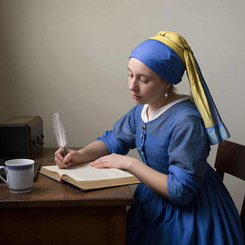 Woman in a vibrant blue dress sits attentively at a wooden desk, her hands poised over an open book as she writes with a quill pen, surrounded by period furnishings including a small chest and a ceramic mug, evoking the style of Johannes Vermeer's intimate interiors.