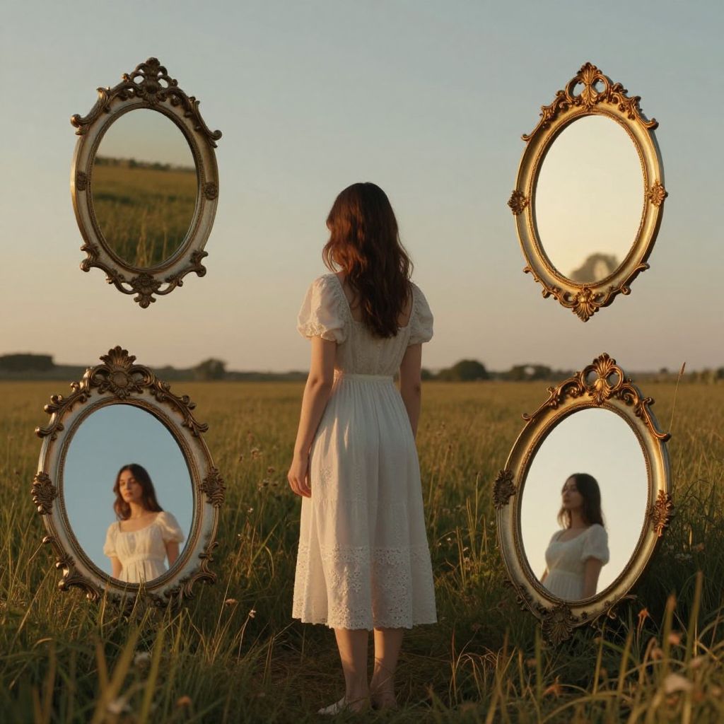 In a serene field bathed in golden-hour light, a woman stands amidst ornate mirrors that reflect not her current self, but the infinite possibilities of her future, each frame shimmering with the promise of transformation.