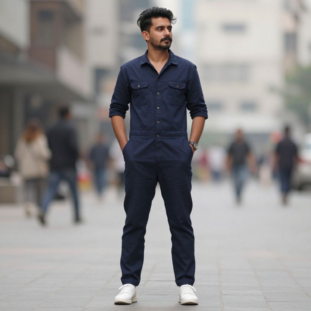 White pants man, 1boy, male focus, facial hair, belt, shirt, pants, outdoors, building, blurry, beard, white shirt, blurry background, standing, hands in pockets, shoes, full body, realistic, solo, mustache, black hair