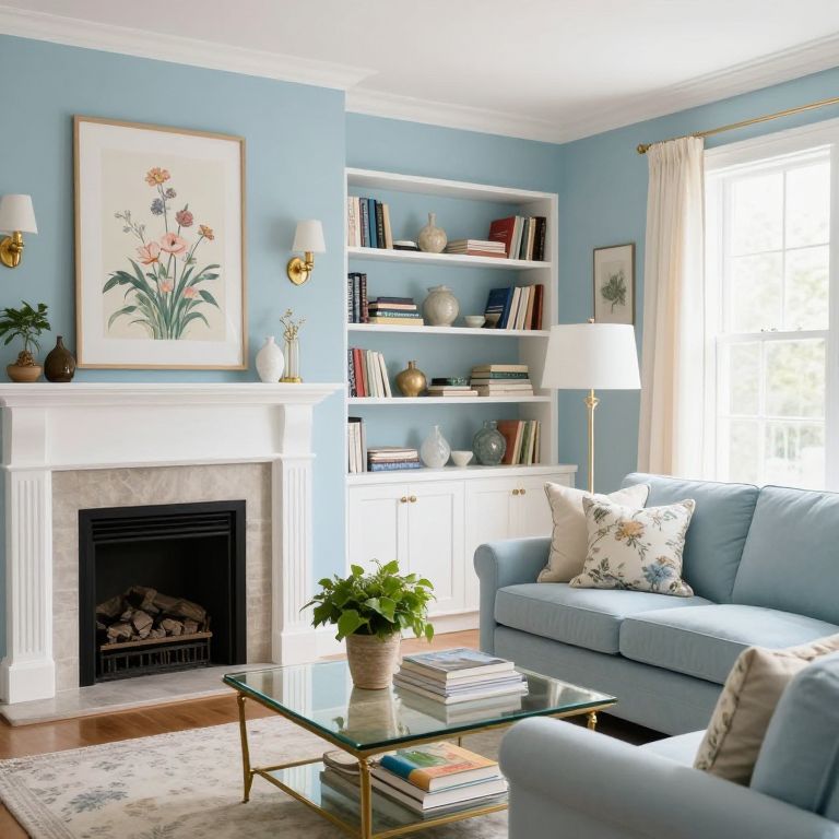 Cozy living room featuring light blue walls, a white fireplace with floral artwork above, two gold sconces, a built-in shelving unit filled with books and decorative items, a glass-top coffee table with books and a green plant, a light blue sofa with floral pillows, a cream armchair with a matching pillow, and a tall lamp with a white shade positioned near the window.