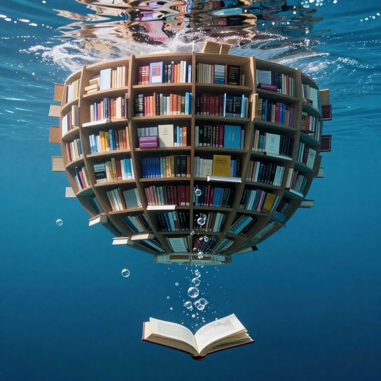 A digitally rendered image of a spherical bookshelf submerged underwater, filled with colorful books of various sizes and colors. The sphere is illuminated from above, causing light to reflect off its surface. Bubbles rise from the bottom of the image, where an open book floats, as if recently released from the sphere. The background is a deep blue, with light and shadow creating a sense of depth and movement. The overall style is hyper-realistic, with a whimsical, surreal touch.