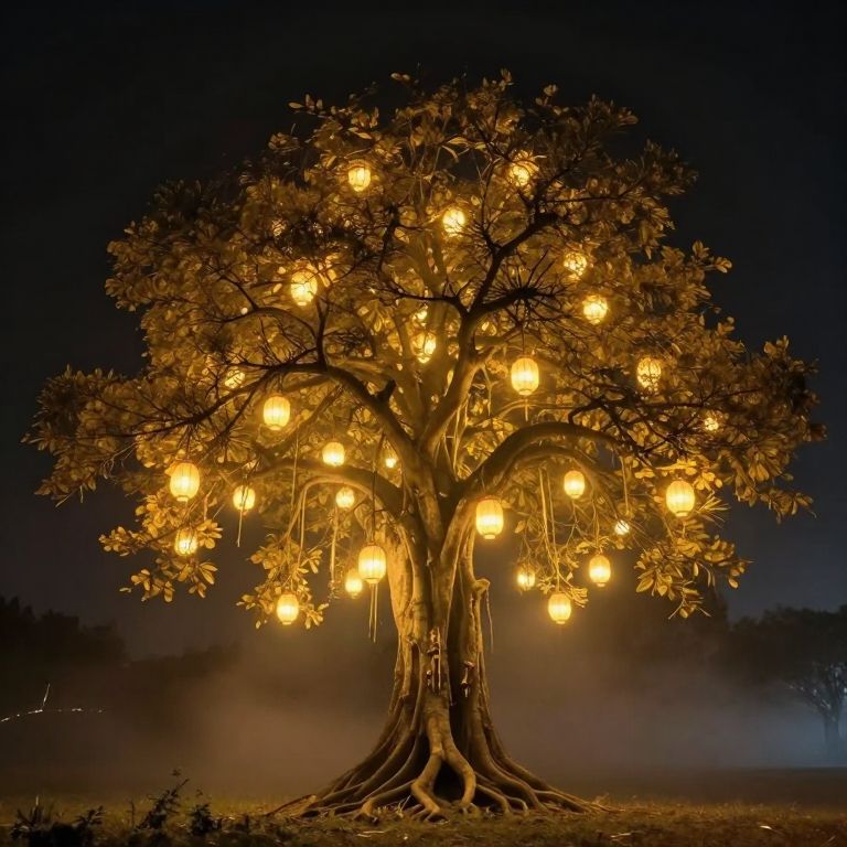 Photograph of a large tree at night, illuminated by numerous glowing incandescent bulbs hanging from its branches. The tree has a thick, textured trunk with visible roots and a wide, spreading canopy of leaves. The warm yellow light from the bulbs contrasts sharply with the dark, misty background, creating a magical, ethereal atmosphere. The mist adds a soft, diffused glow, enhancing the tree's illuminated outline. The ground is barely visible, but the base of the tree is situated in a grassy area. The overall scene evokes a sense of enchantment and wonder.