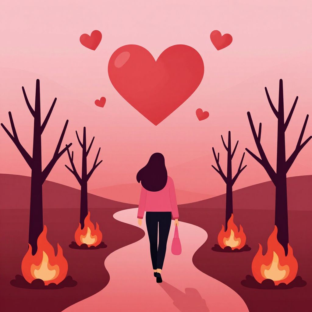 The image presents a lo-fi, minimalist vector illustration with a celestial aesthetic, featuring a woman walking down a winding path surrounded by red hearths. The scene is bathed in a gradient of pink and red hues, creating a warm and inviting atmosphere. The woman, with her long hair flowing, is dressed in a pink jacket and black pants, carrying a pink bag. The path she walks on is lined with dark, leafless trees on either side, adding a sense of depth and perspective to the composition. Above her, a large red heart floats in the sky, surrounded by smaller heart shapes, enhancing the romantic and whimsical feel of the scene. The overall arrangement of elements, with the woman at the center and the heart shapes floating above, creates a balanced and harmonious composition. The flat vector illustration style, combined with the gradient colors and minimalistic design, gives the image a modern and artistic appeal.