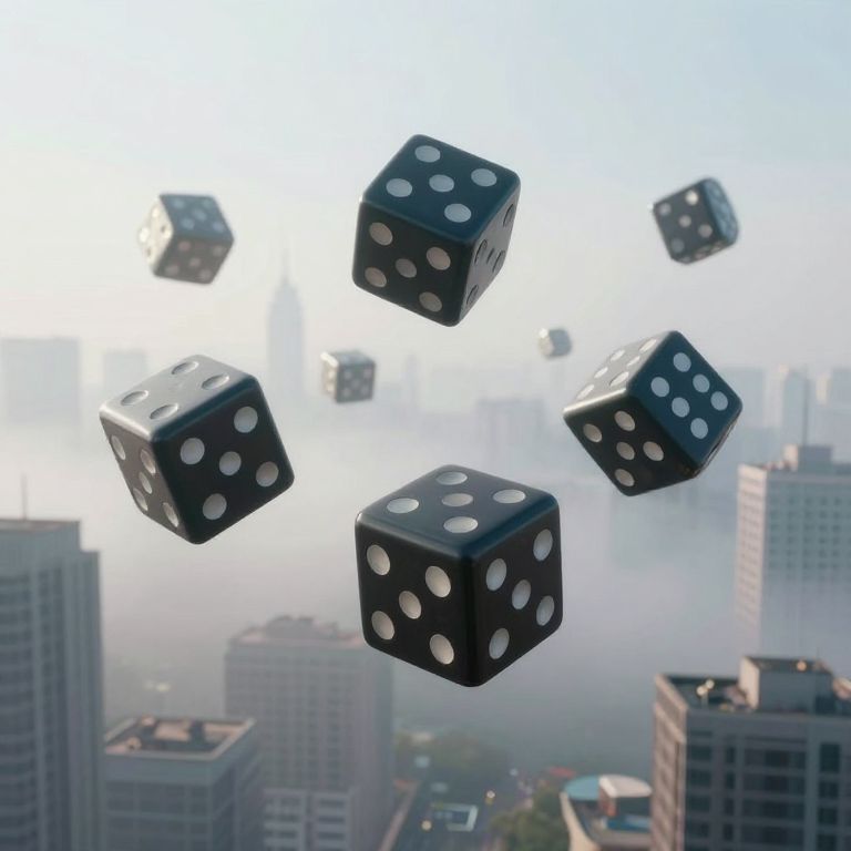 Photograph-like CGI image of seven black dice with white pips floating in mid-air against a foggy cityscape. The dice are randomly positioned, with some showing numbers like 3 and 5. The background features blurred skyscrapers of various heights and colors, creating a sense of depth. The fog adds a mystical, ethereal quality to the scene, softening the outlines of the buildings. The dice are glossy, reflecting light, and the pips are clearly visible. The overall composition combines elements of realism and fantasy, with a modern urban setting.