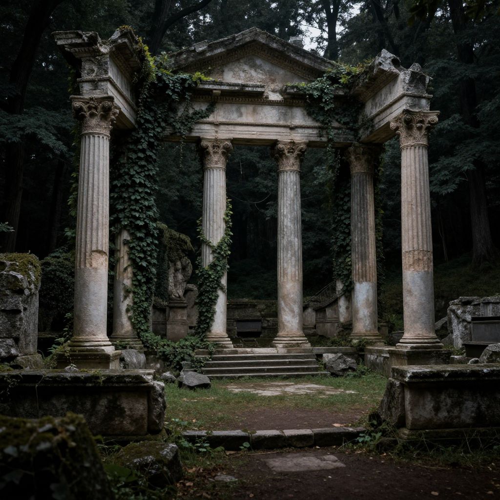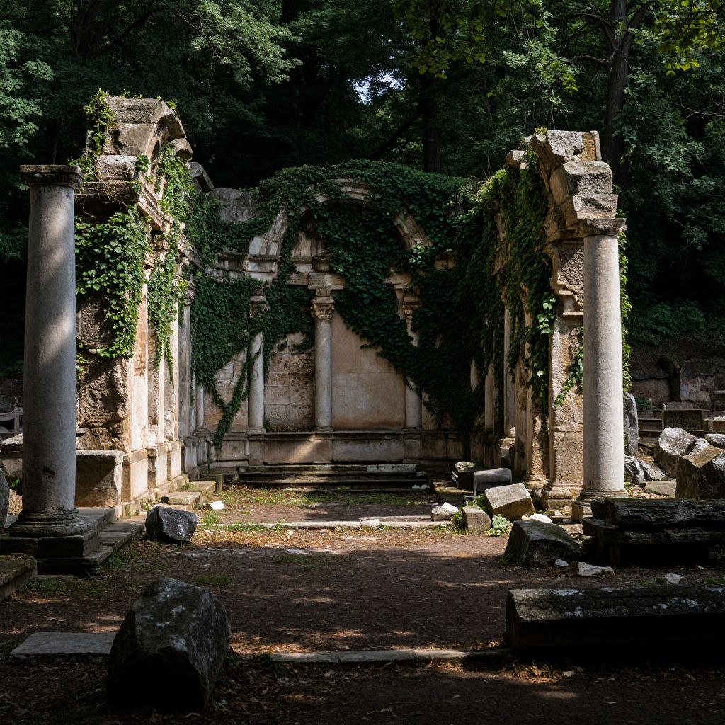 Photograph of an ancient, partially ruined stone building with two tall, white columns on either side. Ivy and vines cover the crumbling stone walls, creating a contrast between the green foliage and the gray, weathered stone. Sunlight filters through the trees, casting dappled shadows on the dirt ground. Scattered rocks and broken stones lie around the structure. The background shows dense, dark green trees, enhancing the sense of an overgrown, forgotten historical site. The overall atmosphere is mysterious and serene, with a sense of ancient history and natural reclamation.