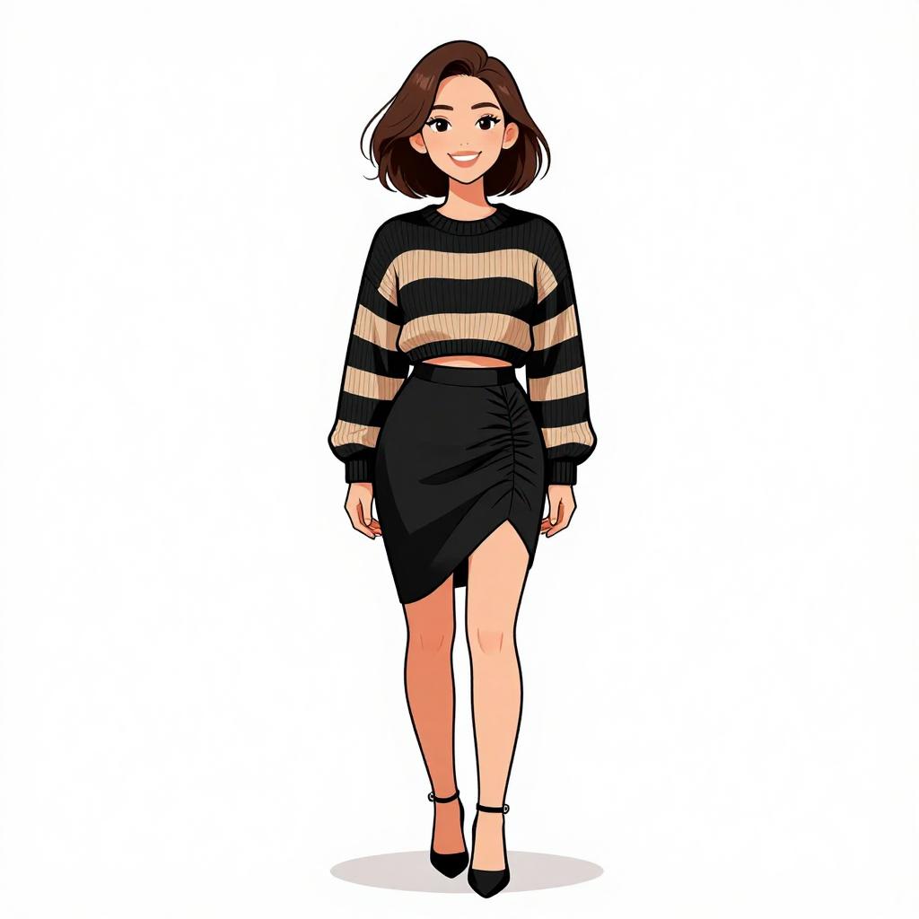 Woman with pretty face and pretty hair. smiling Woman, contemporary casual, cropped knit sweater in black with horizontal tan stripes, crew neck, long sleeves, ruched asymmetrical skirt in black, above-knee length, high-waisted, black strappy heels with ankle closure, plain white studio background. --sref 1467