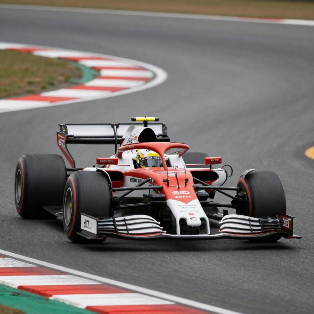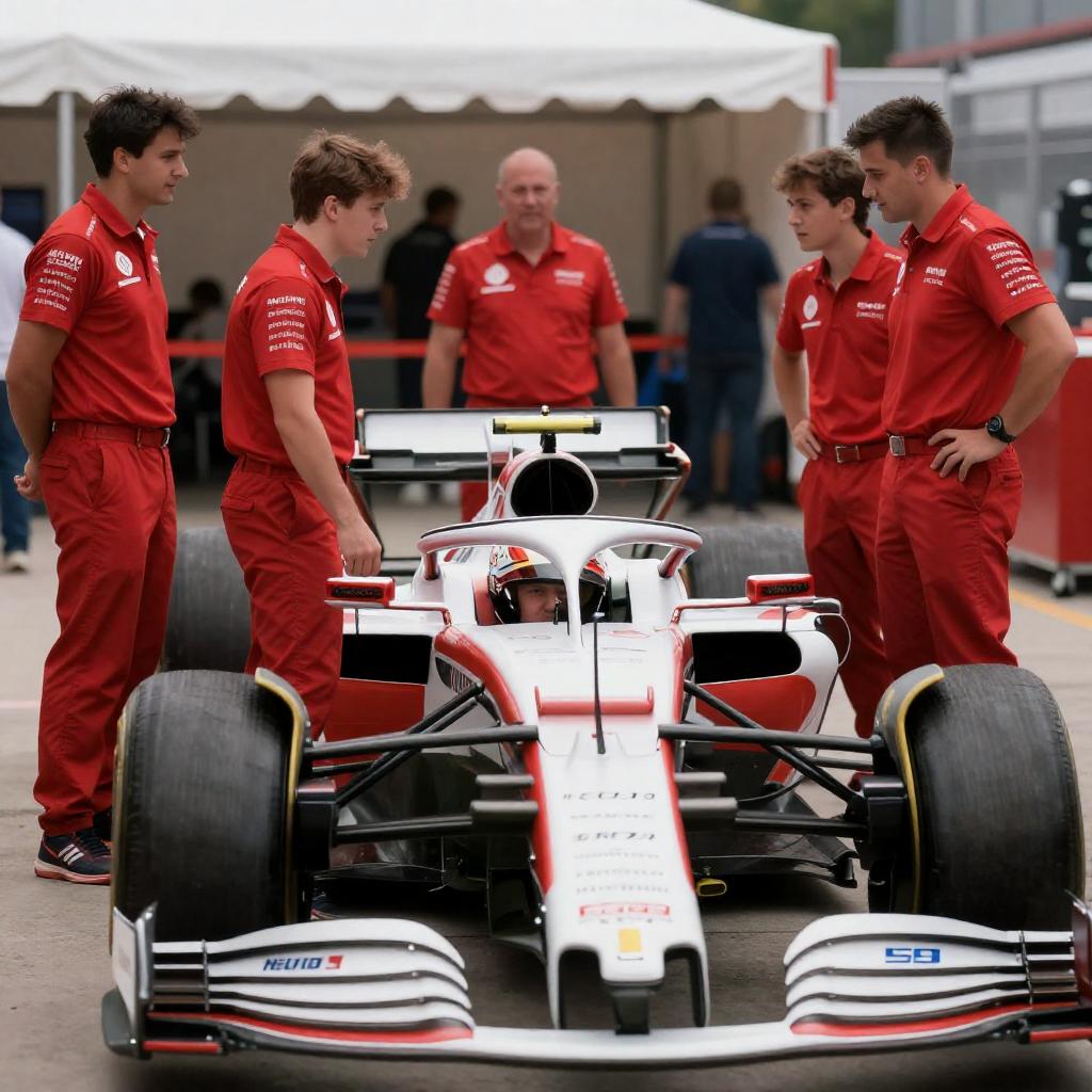 Photograph of a Formula 1 pit stop. Five team members in red uniforms stand around a red and white race car. One team member is talking to a driver inside the car. Background includes a tent and other people. Intense expressions on team members' faces.