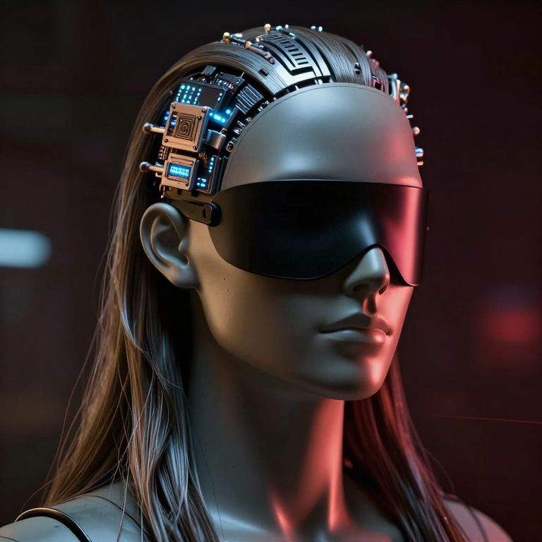 Photograph of a futuristic, gray, life-sized mannequin head with long, straight brown hair. The mannequin wears a high-tech, cybernetic headband adorned with glowing circuit boards and small LED lights. It also has large, black, reflective sunglasses covering its eyes. The lighting is dramatic, with a mix of red and blue highlights creating a high-contrast, sci-fi aesthetic. The background is dark and blurry, emphasizing the mannequin's futuristic features. The image has a high-tech, dystopian vibe, with a focus on cybernetic and artificial intelligence themes.