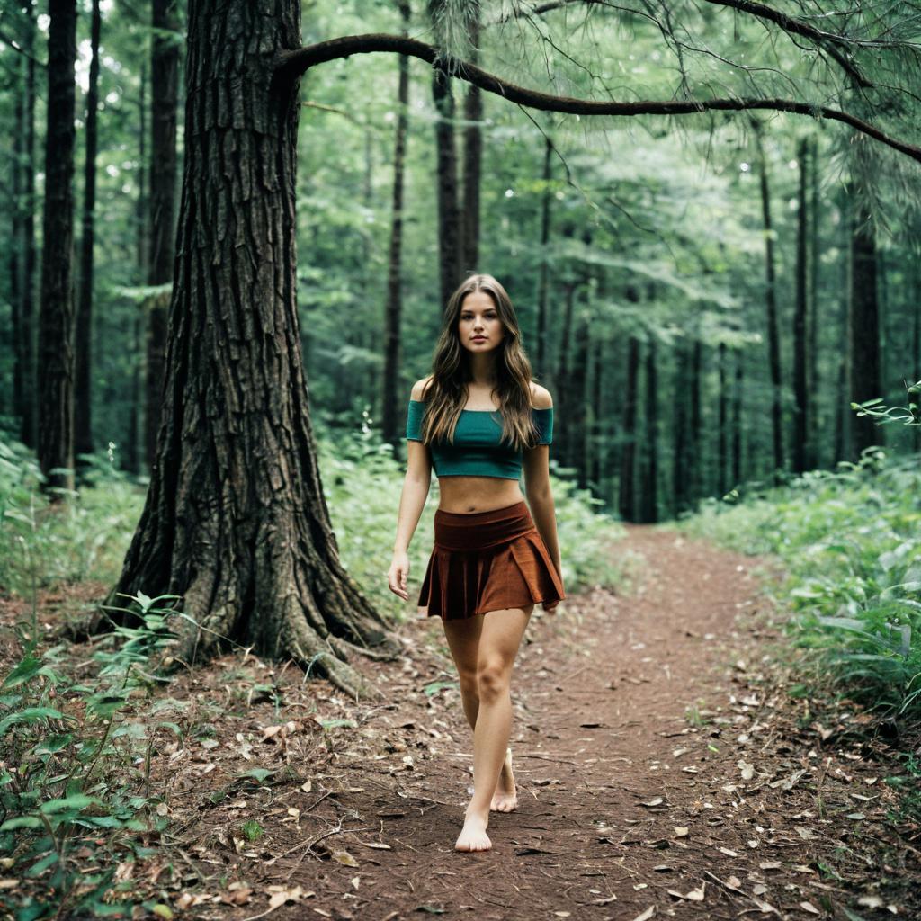 Blonde woman walking on a gravel path surrounded by wildflowers and green grasses in a mountainous outdoor setting. She wears a white short-sleeved crop top paired with a pink floral skirt and brown sandals. The background features rocky mountains under natural daylight, creating a serene atmosphere.
