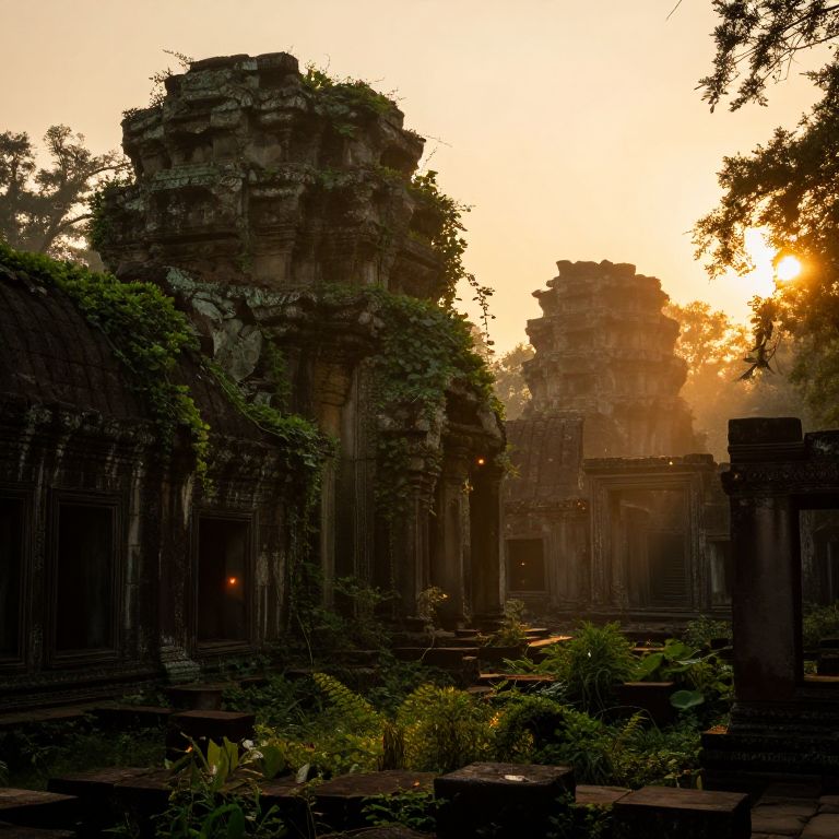 Former ancient city ruins bathed in golden sunset light, overgrown with lush greenery and vines, crumbling stone structures blending with nature, misty atmosphere with soft glowing embers in the air, cinematic and nostalgic mood