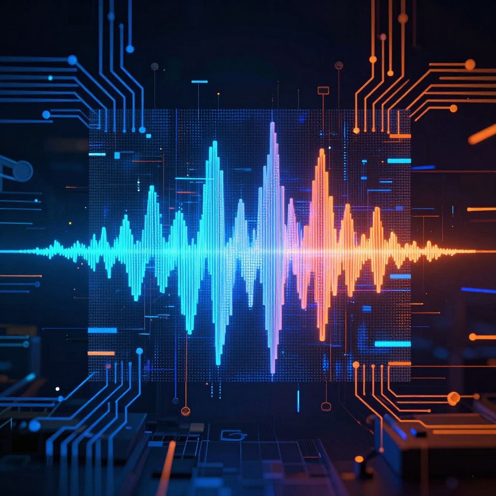 An artistic depiction of AnalogDiffusion concept showing a blend of analog waveforms morphing into pixelated digital grids, surrounded by floating circuitry and data streams, set against a dark background with vibrant blue and orange neon accents.