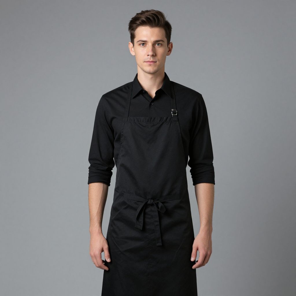 "Top Man Dress, man in a black shirt and black apron posing for a picture"