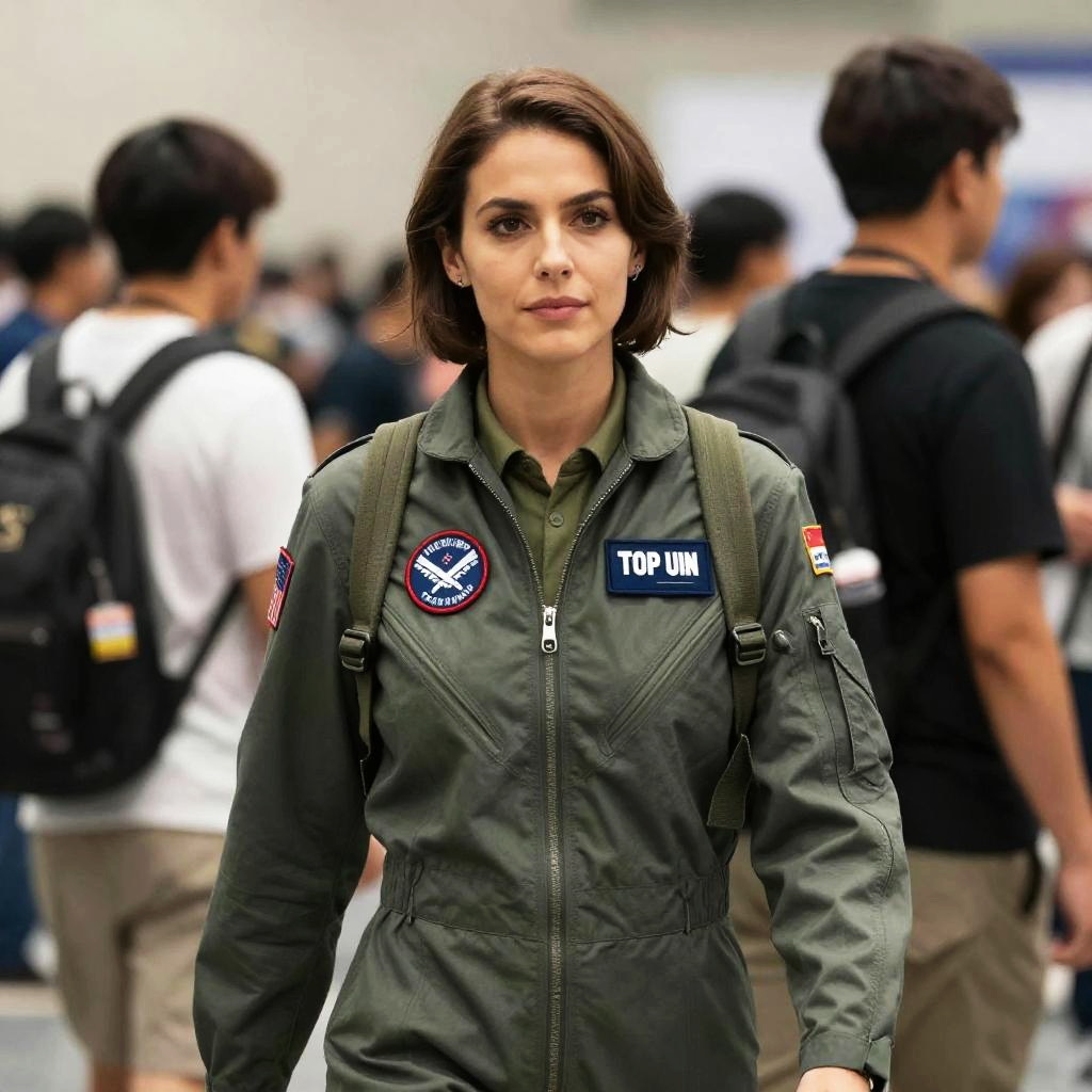 A confident woman dressed in a detailed Top Gun-inspired flight suit stands at a cosplay convention, surrounded by blurred attendees. The natural lighting highlights her focused expression and the authentic patches on her green aviator jumpsuit, capturing the essence of the iconic pilot style.