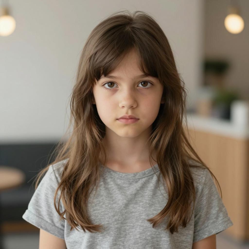 Odd squad uniform, photorealistic portrait of a young girl, light skin, blue eyes, brown bob haircut, wearing a beige Scouting uniform with black buttons, white shirt, black tie, scouting badges on chest and sleeve, neutral gray background, studio lighting, upper body, serious expression, slight smile, detailed ures, realistic shading, focus on face, uniform slightly open