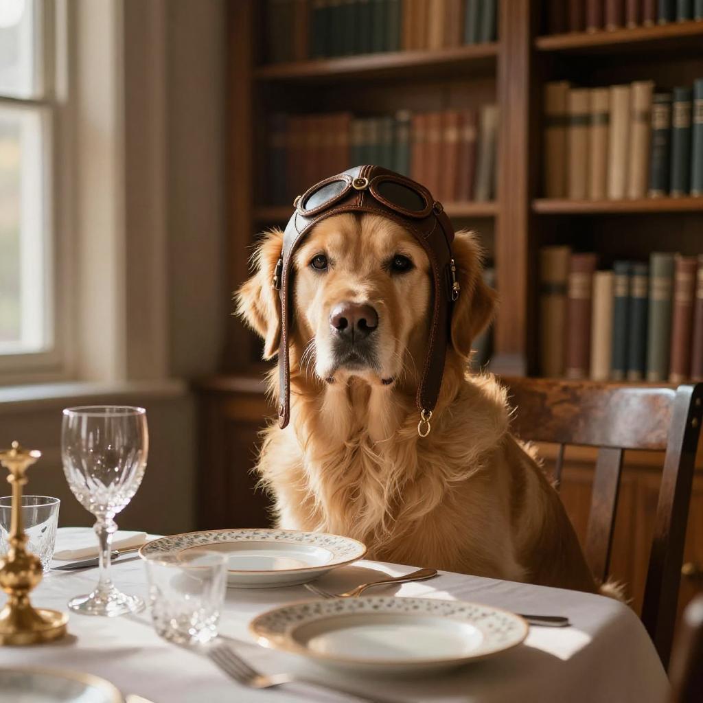 Ancient golden retriever wearing a leather aviator cap seated at a fine dining table in a sunlit rustic library with towering oak bookshelves, with crystal and porcelain plateware, f/1.4 200mm zoom shallow depth of field, ultra sharp photograph, (soft golden afternoon rays:1.2) (masterpiece:1.2) (photorealistic:1.2) (bokeh) (best quality) (intricate) (8k) (HDR) (cinematic lighting) (sharp focus)