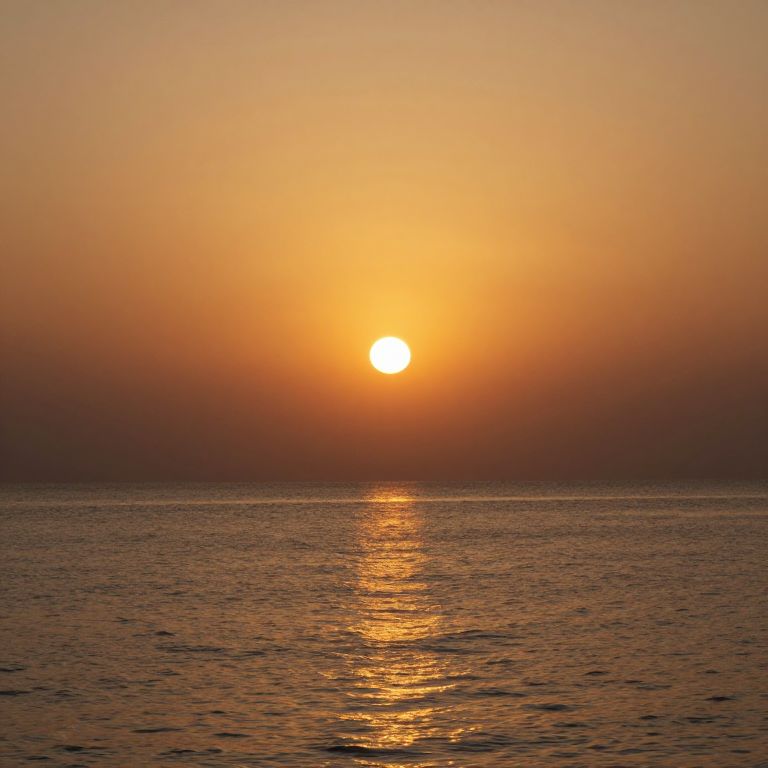 Photograph of a serene sunset over a calm ocean, with the sun glowing brightly orange, casting a golden reflection on the water.