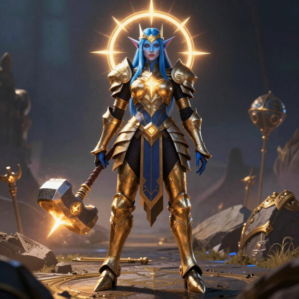 Female draenei paladin standing heroic on a battlefield, glowing blue skin, intricate golden armor with holy symbols, radiant light emanating from her hammer, epic fantasy style