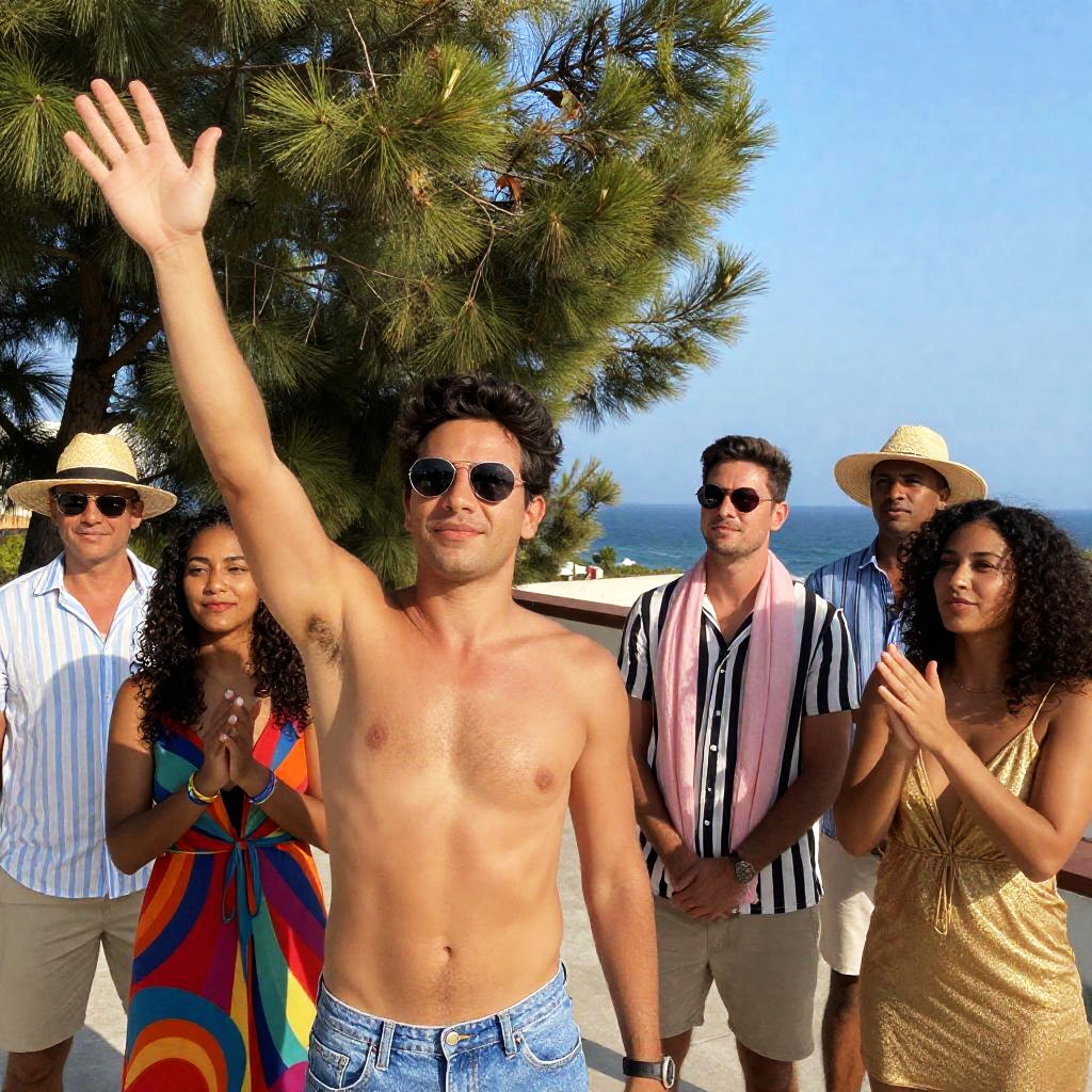 Three people on a boat. Woman in red bikini top, white pants, sitting left. Man in blue shirt, black cap, beard, sitting center. Man in black tank top, cap, standing right, arm raised. Blue water, green shore, American flag. Bright sunlight.