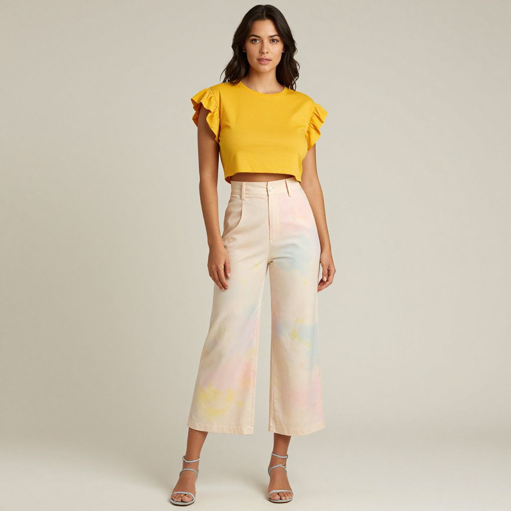 "Woman, contemporary casual, cropped white blouse with a front tie, V-neck, elasticized puff sleeves, high-waisted pink trousers, straight cut, button closure, ankle-length, chunky sole black ankle boots, plain white socks visible, white studio background.. Sexy. Pretty face and beаutiful eyes. Big breasts."
