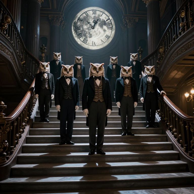 In a surreal, computer-generated Victorian setting, a parliament of owls clad in formal waistcoats stands solemnly on an endless staircase, their sharp eyes fixed on a luminous, clockwork moon that casts dramatic, shifting shadows across the mirrored steps, evoking a blend of fantasy and steampunk aesthetics.