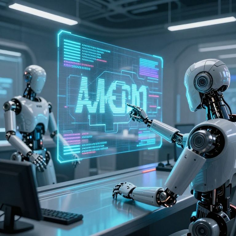 Photograph of two white, futuristic, robotic humans in a high-tech lab, interacting with a glowing blue holographic screen displaying "ALGO" in