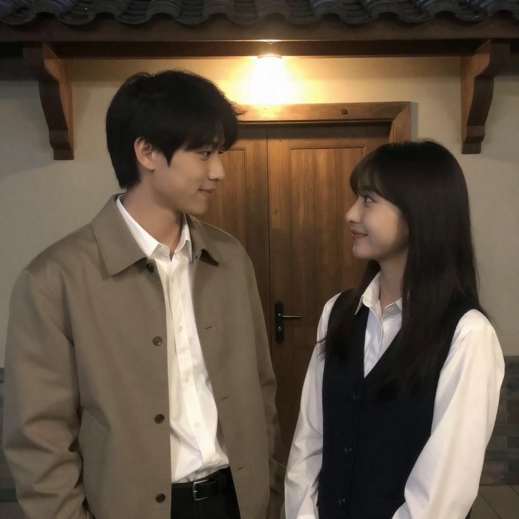 Nighttime photograph of a man and woman standing close, facing each other, smiling. Man has dark hair, light brown jacket, white shirt; woman has long dark hair, white shirt, black vest. Warm light from overhead lamp. Background: wooden door, metal roof.