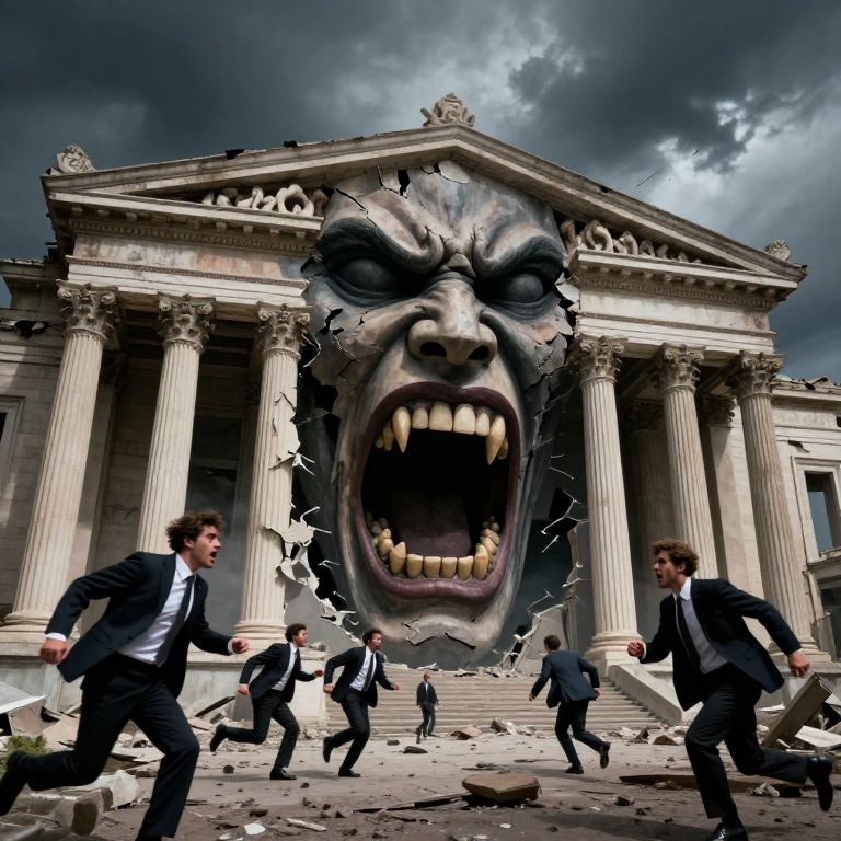 In this surreal and ominous scene, a colossal, menacing face with sharp teeth and a snarling expression emerges from the ruins of a classical building, symbolizing the end of capitalism. The face, with its dark, jagged features, dominates the center of the image, its mouth wide open as if roaring. Surrounding the face are figures dressed in formal suits, running away in panic, their expressions of fear and desperation evident. The building, once grand and imposing, now lies in ruins, its columns and pediment shattered and twisted, hinting at a catastrophic event. The sky above is dark and foreboding, adding to the sense of impending doom. The overall composition, with the face emerging from the ruins and the fleeing figures, creates a powerful visual narrative of a society in crisis, where the symbols of power and wealth have been destroyed, and the remnants of humanity scramble to escape.