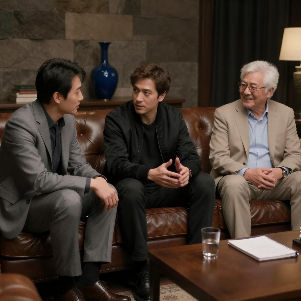 Two Asian men in a dimly lit room, sitting at a wooden table. Man on left in blue suit, arms crossed, looking down. Man on right in gray suit, hands clasped, focused. Bottles, plates with spaghetti, colorful abstract painting in background. Man on right has dark hair, man on left has slightly greying hair. Both have neutral expressions. Brightly colored painting features swirling shapes and clouds. Table also has papers and a glass.