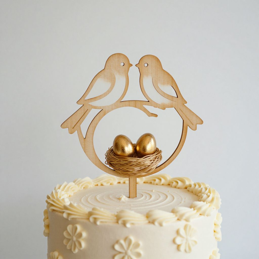 Elegant wooden wedding cake topper featuring two love birds perched on a minimalist tree design, cradling a delicate nest filled with golden eggs, set atop a cream-frosted cake with intricate floral piping.