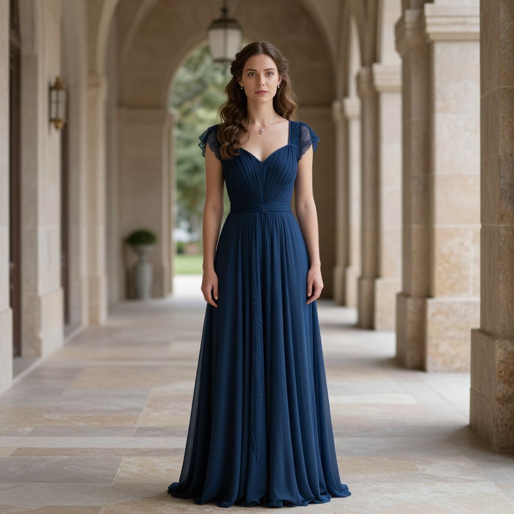 Photograph of a young woman standing in a colonnade with arches, wearing a floor-length, deep blue, V-neck gown with cap sleeves and a pleated waist. Her long, wavy brown hair is styled loosely. The stone columns and arches frame the background, which includes a blurred greenery and a lamp. The stone floor is light beige, and the lighting is soft, creating a serene, elegant atmosphere. She has a fair complexion and a composed expression. The gown's fabric appears lightweight and flowing. The overall style is classic and formal.