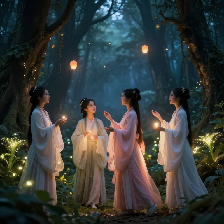 Prompt for kids girls: A magical forest path where girls in handmade dresses run through glowing trees, carrying lanterns and smiling, with fantasy creatures in the background, creating a safe, imaginative world for young minds.