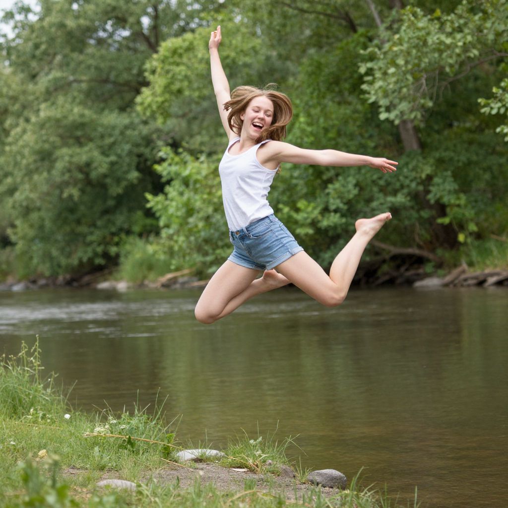 An exuberant leap of freedom captures the essence of boundless joy and carefree abandon, as a young woman soars above the serene riverbank, her laughter echoing through the lush green embrace of summer, embodying the ephemeral beauty of youthful exuberance and the timeless allure of nature’s embrace.